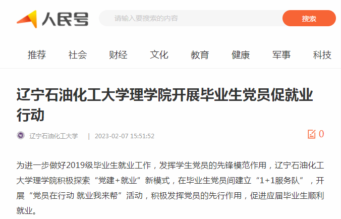 编者按:近日,辽宁日报·北国号、人民日报客户端·人民号等媒体平台对我校理学院积极探索“党建+就业”新模式,在毕业生党员间建立“1+1服务队”,开展“党员在行动就业我来帮”活动,积极发挥党员的先行作用,促进应届毕业生顺利就业进行了宣传报道。现将相关报道转载如下: