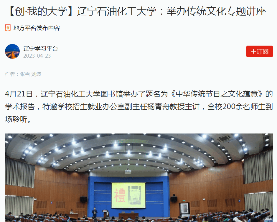 编者按:近日,学习强国辽宁学习平台、辽宁日报·北国号、人民日报客户端·人民号等媒体平台对我校图书馆举办了题名为《中华传统节日之文化蕴意》的学术报告,特邀学校招生就业办公室副主任杨青舟教授主讲,全校200余名师生到场聆听进行了宣传报道。现将相关报道转载如下:
