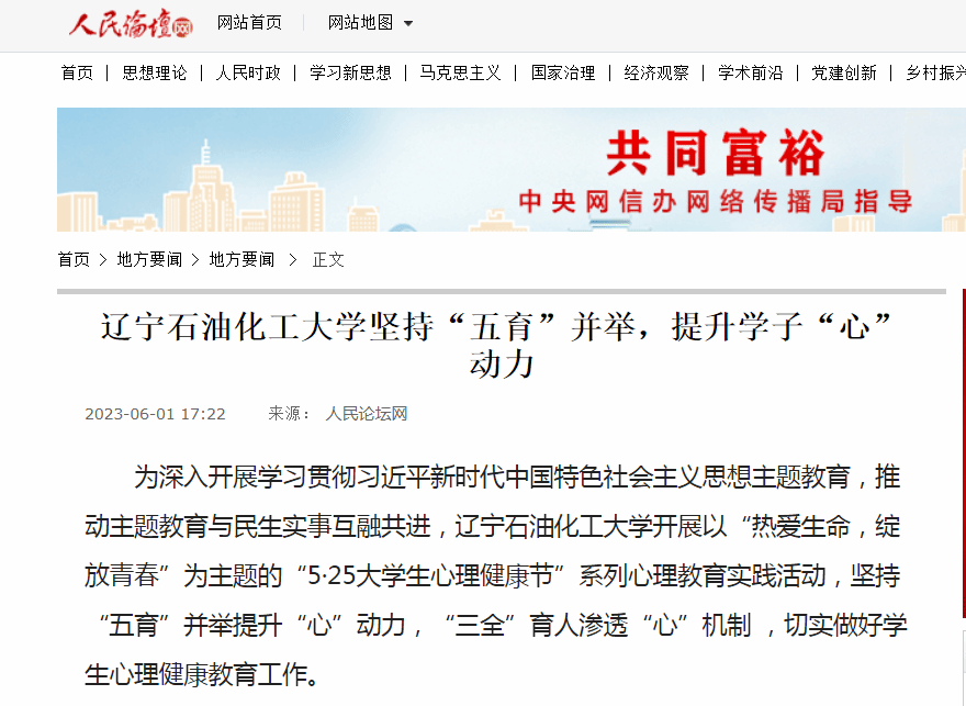 编者按:近日,人民论坛网、中国大学生在线、全国高校思想政治工作网、辽宁日报·北国号、人民日报客户端·人民号对我校深入开展学习贯彻习近平新时代中国特色社会主义思想主题教育,推动主题教育与民生实事互融共进,以“时时放心不下”的责任感,开展“热爱生命,绽放青春”为主题的“5·25大学生心理健康节”系列心理教育实践活动,坚持“五育”并举提升“心”动力,“三全”育人渗透“心”机制,切实做好学生心理健康教育工作进行了宣传报道。现将相关报道转载如下: