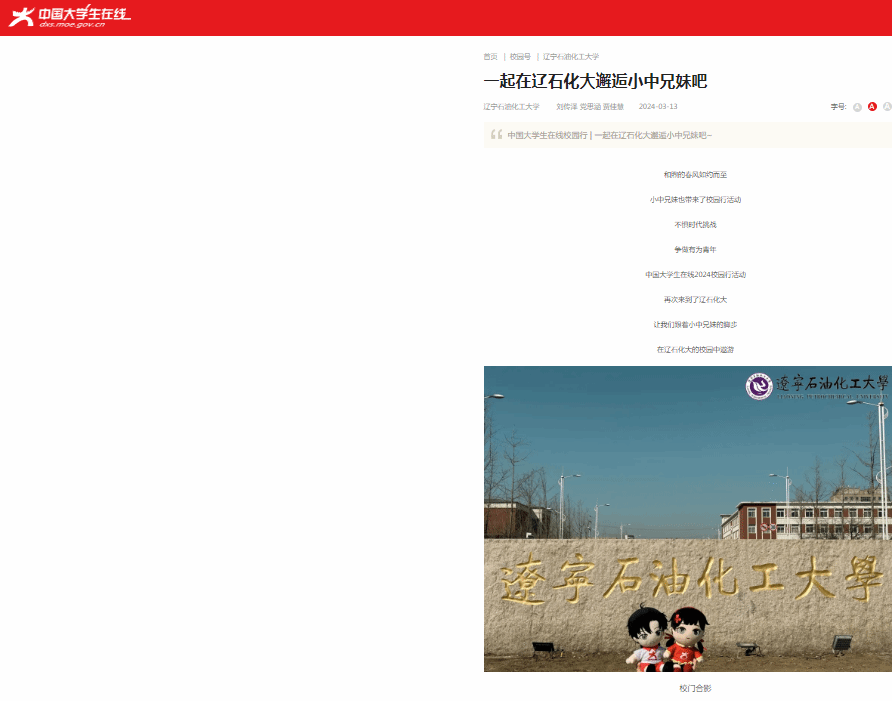 编者按:不惧时代挑战,争做有为青年。中国大学生在线2024校园行活动再次来到了辽石化大,新媒体中心的同学带着小中兄妹在辽石化大校园各处打卡,教育部中国大学生在线对此进行了宣传报道。现将相关报道转载如下: