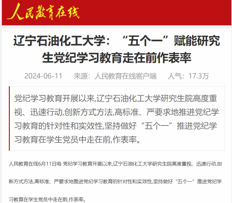 编者按:近日,人民教育在线(客户端)、中国网、中国周刊网等媒体平台对我校研究生党纪学习教育开展情况进行了宣传报道。现将相关报道转载如下: