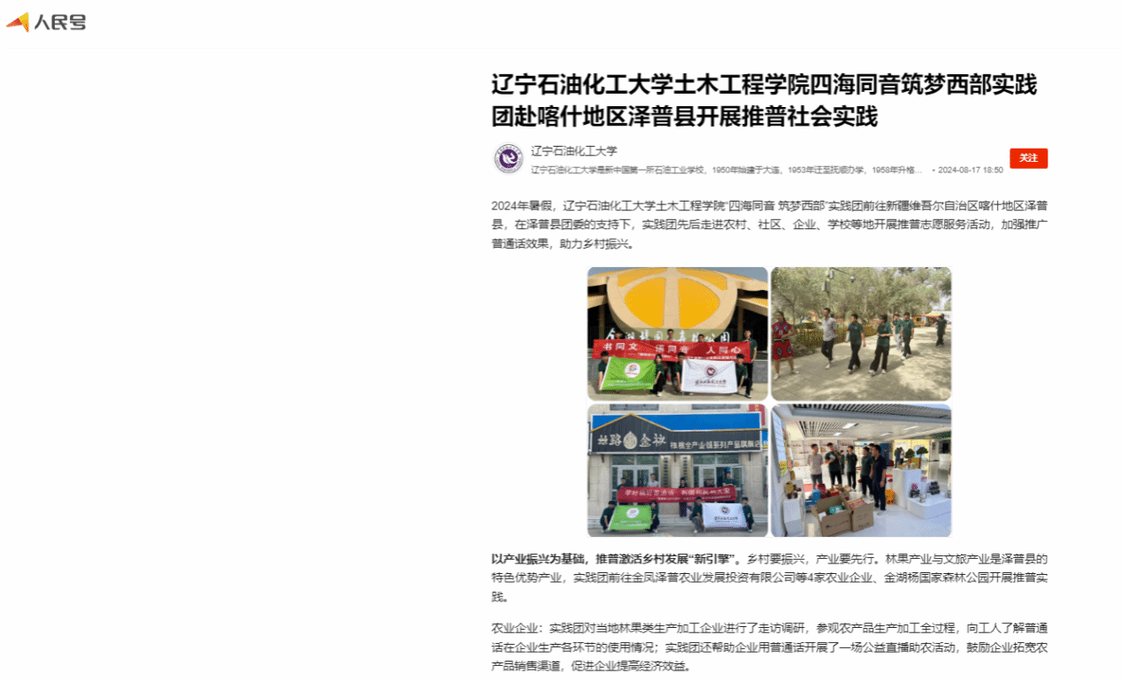 编者按:土木工程学院“四海同音 筑梦西部”实践团前往新疆维吾尔自治区喀什地区泽普县,在泽普县团委的支持下,实践团先后走进农村、社区、企业、学校等地开展推普志愿服务活动,加强推广普通话效果,助力乡村振兴。人民日报客户端•人民号对此进行了宣传报道。现将相关报道转载如下: