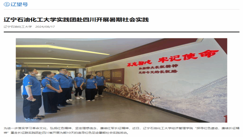 编者按:为进一步落实学习革命文化,弘扬红色精神,坚定理想信念,赓续红军长征精神,经济管理学院“探寻红色遗迹,赓续长征精神”重走长征路实践团赴四川省开展为期10天的追寻红色足迹暑期社会实践活动。人民日报客户端•人民号、辽宁日报•辽望号对此进行了宣传报道。现将相关报道转载如下: