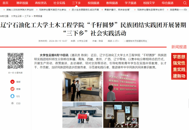 编者按:土木工程学院“千籽圆梦”民族团结实践团组织师生分别前往新疆、青海、西藏、贵州、广西、辽宁等地,以集中和分散相结合的方式,开展生产劳动、政策宣讲、走访调研、结对交流等活动,引导和帮助青年学生在实践中受教育、长才干、作贡献,当好民族团结进步的宣传者、示范者和践行者。全国高校思想政治工作网、大学生云报网对此进行了宣传报道。现将相关报道转载如下: