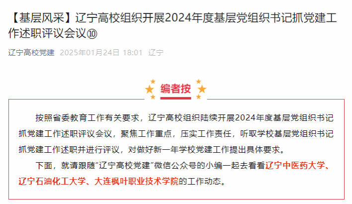 编者按:按照省委教育工作有关要求,辽宁高校组织陆续开展2024年度基层党组织书记抓党建工作述职评议会议,聚焦工作重点,压实工作责任,听取学校基层党组织书记抓党建工作述职并进行评议,对做好新一年学校党建工作提出具体要求。1月24日,辽宁高校党建微信公众号对我校召开二级党组织书记抓基层党建述职评议会暨2024年度学校党政部门(单位)正职述职述廉会进行了组稿宣传。现将相关报道转载如下: