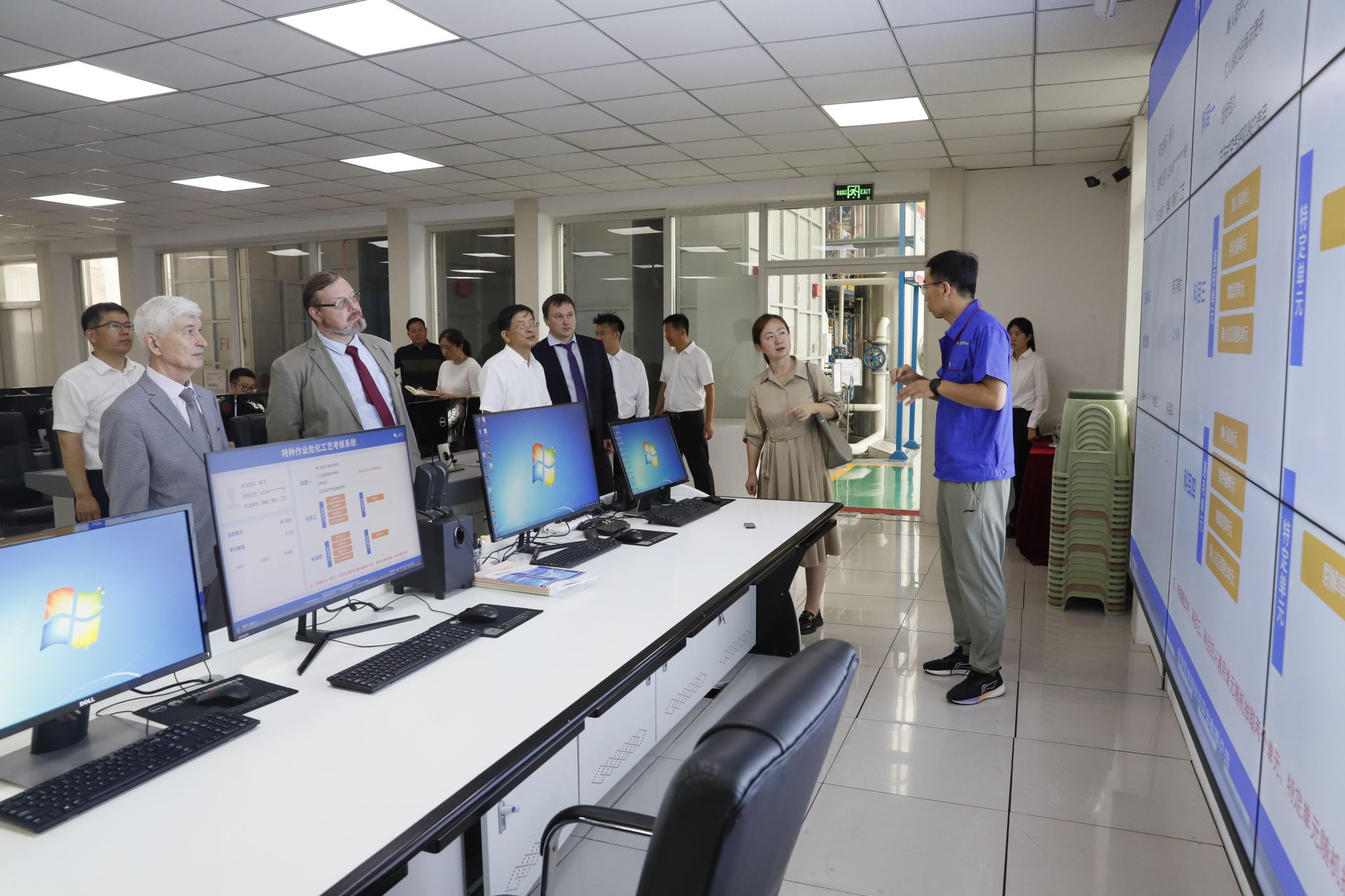 俄罗斯专家团一行,在钱建华、曹江涛、杨占旭等的陪同下先后参观了辽宁省石化产业技术创新研究院、辽宁省石油化工催化科学与技术重点实验室、石油化工产业链实训培训基地。在辽宁省石化产业技术创新研究院,俄罗斯专家团走进聚烯烃材料分析室、催化剂评价实验室、电化学储能实验室等实验室,深入了解研究院关键技术研发、成果转移转化、企业孵化培育等方面情况。在辽宁省石油化工催化科学与技术重点实验室,俄罗斯专家团听取了该实验室在新型催化材料及工艺、清洁燃料生产工艺与催化剂、重质油深度加工新技术等方面的研究成果以及承担国际、国家及行业重大项目情况。俄罗斯专家团还走进作为学校实践教学改革标志性成果之一的石油化工产业链实训培训基地,实地了解平台建设及学生实践教学情况,高度评价了这一覆盖石油化工全产业链的虚拟仿真实践教学平台。