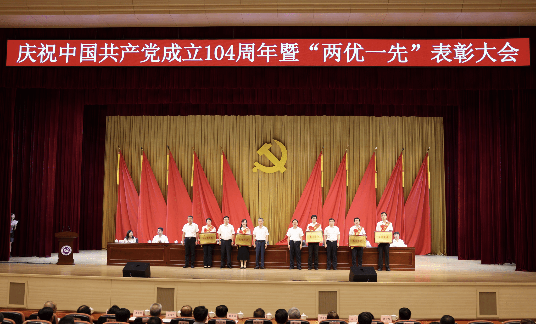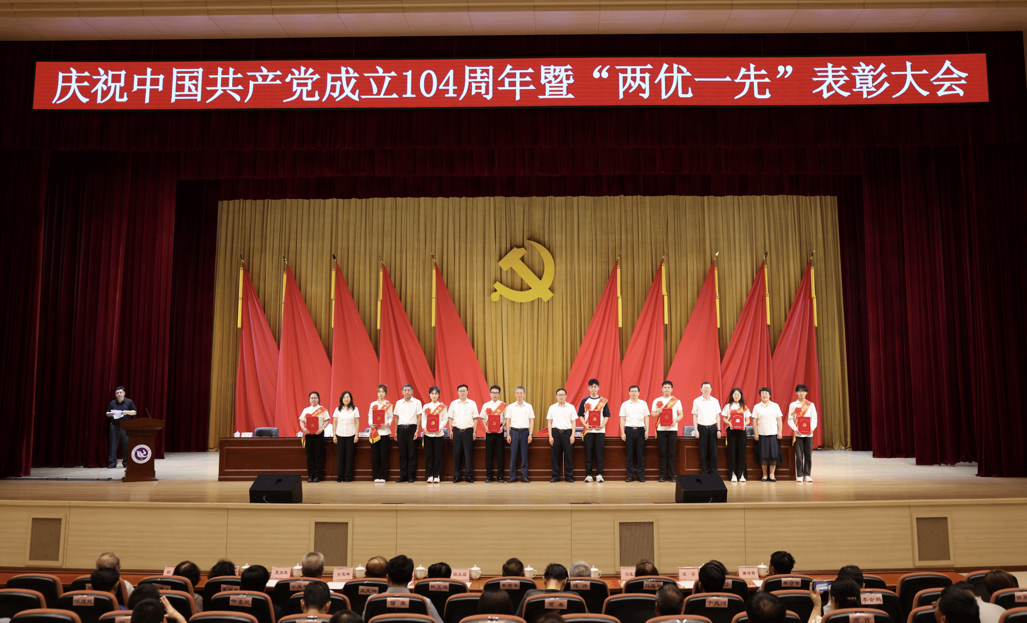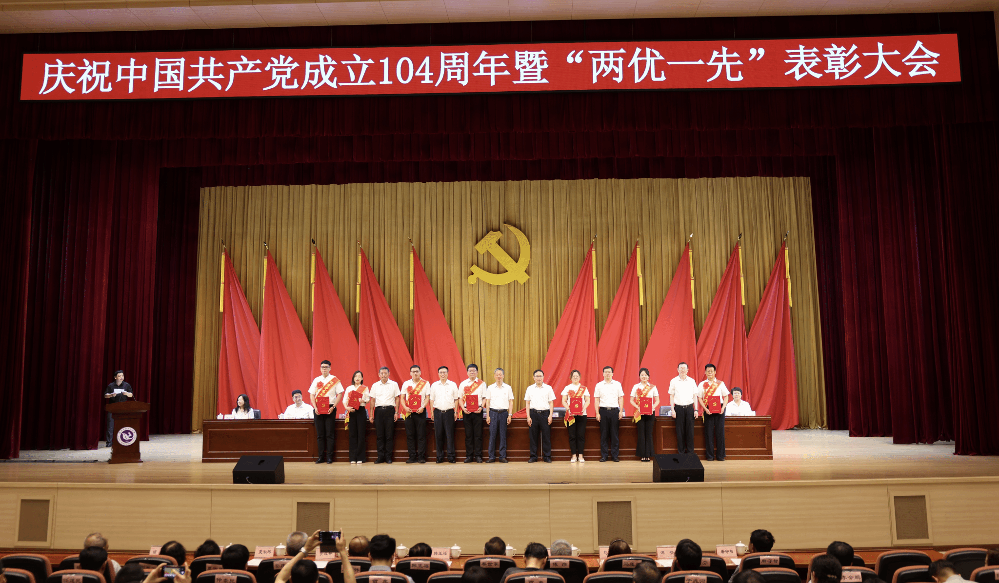6月30日下午,学校党委召开2023-2025年度“两优一先”表彰大会,庆祝中国共产党成立104周年,深入学习贯彻习近平新时代中国特色社会主义思想,表彰优秀共产党员、优秀党务工作者、先进基层党组织,向学校党龄达到50周年的老党员颁发“光荣在党50年”纪念章。学校领导班子、处级干部、组织员、党支部书记、“两优一先”获得者、“光荣在党50年”老党员代表、师生党员代表参加了会议。会议由党委副书记钟俊生主持。
