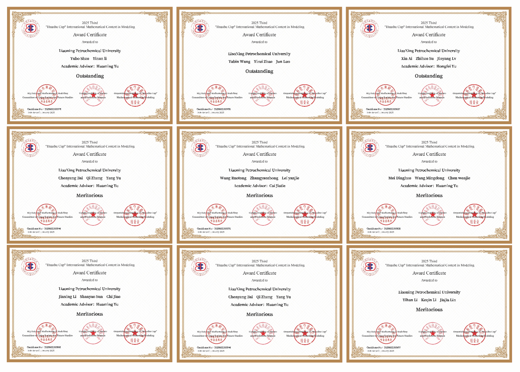 近日,经“华数杯”国际大学生数学建模竞赛专家组初评、复评、会评和最终审核四个阶段的严格评审,组委会公示了2025年“华数杯”国际大学生数学建模竞赛获奖成绩。我校学子荣获国家级Outstanding奖(特等奖)3项、Meritorious(一等奖)7项、Honorable Mention(二等奖)15项、Successful Participant(优秀奖)34项,创历史佳绩。